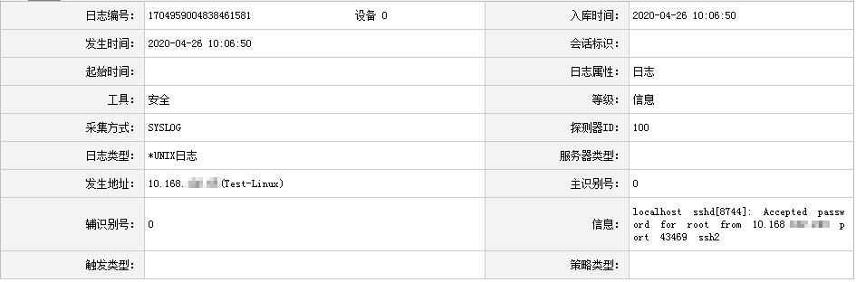 1 2 3 4 5 | // 在rsyslog.conf文件末尾增加如下内容,注意*.*和@中间为TAB(不是空格)*.* @10.168.1.100// 重启rsyslog服务# service rsyslog restart |