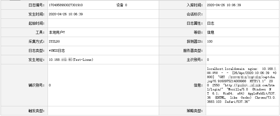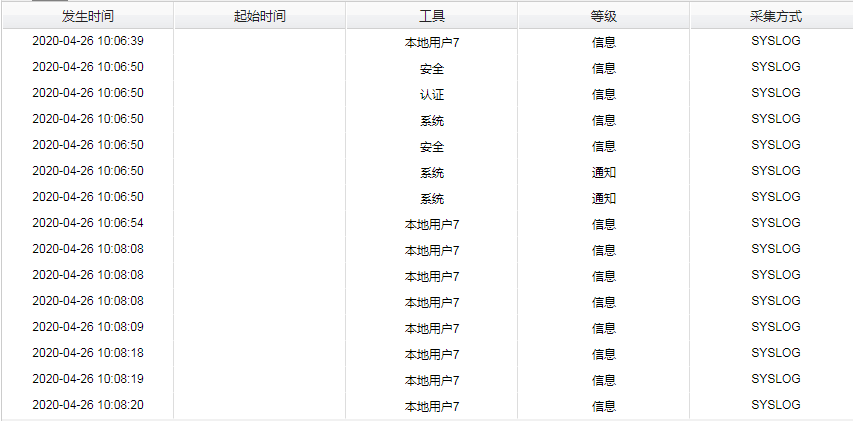 日志审计服务器上收集到的日志列表,标记为本地用户7(local7)的为nginx日志,其余的为服务器的系统日志(用户登录、注销等)