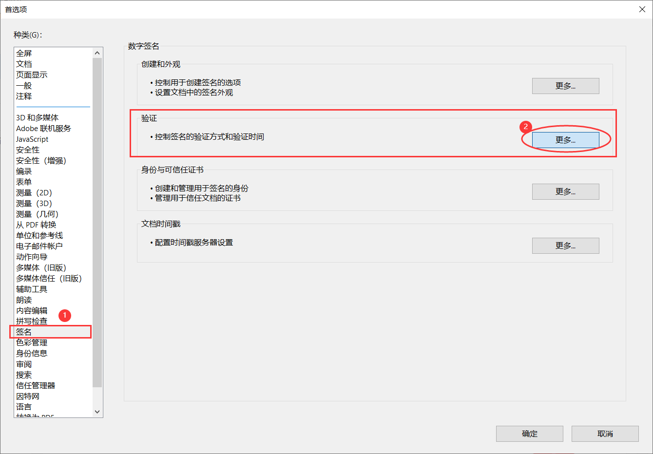 打开【Adobe Acrobat PDF】→【编辑】→【首选项...】→【签名】→【验证】→【更多...】