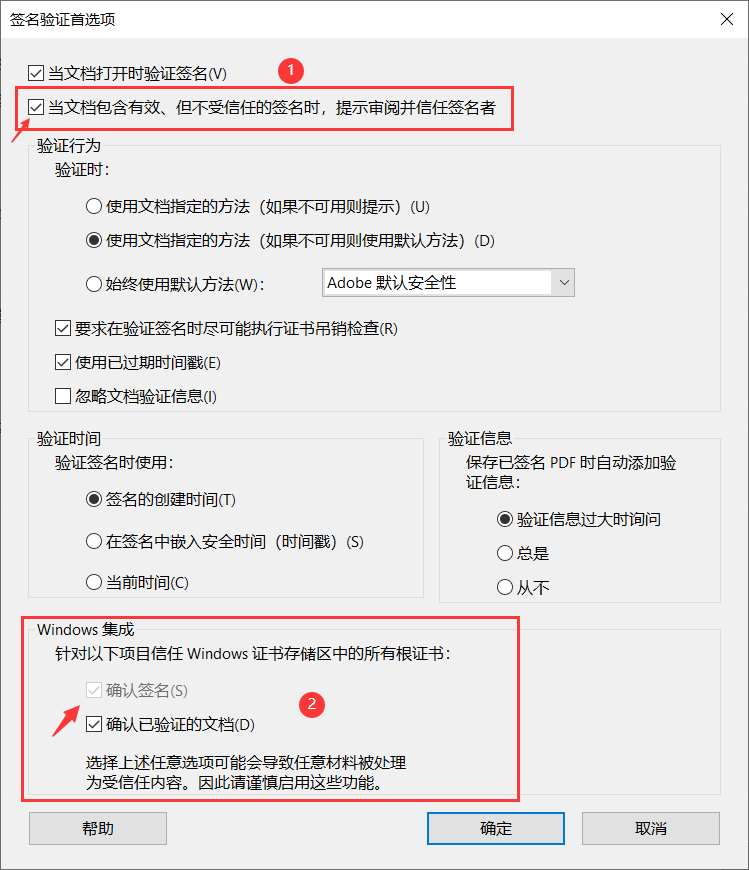 ② →【Windows集成】→勾选 √ 确认已验证的文档