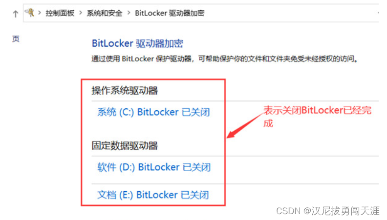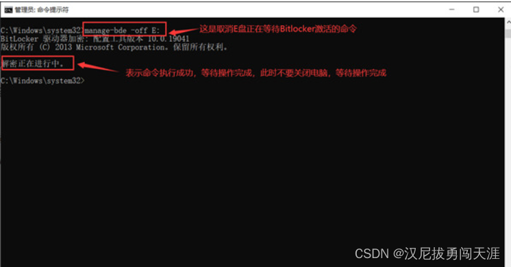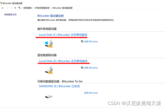 硬盘黄色感叹号如何取消 BitLocker 正在等待激活 2022-12-24 控制面板--->系统安全--->管理BitLocker此时发现没有“关闭BitLocker”按钮: 方法: 1、鼠标右键选中开始菜单,之后选择“windows powershell(管理员)”,输入“manage-bde -off D:”,这里要注意盘符后面的冒号同样要输入。2、之后就可以看到系统提示的正在等待激活BitLocker已经不见了