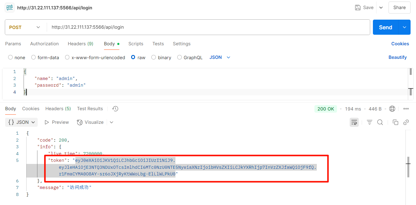 首先登录获取授权,授权接口POST:http://127.0.0.1:5566/api/login