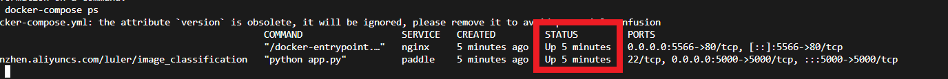 复制version: "3"services: paddle: image: registry.cn-shenzhen.aliyuncs.com/luler/image_classification restart: always ports: - 5000:5000 volumes: - .:/root/work nginx: image: nginx:1.21.6 restart: always ports: - 5566:80 volumes: - ./log/nginx_logs:/var/log/nginx - ./web/dist:/home/wwwroot/web/dist - ./static:/home/wwwroot/resource/static - ./config/nginx/conf.d:/etc/nginx/conf.d