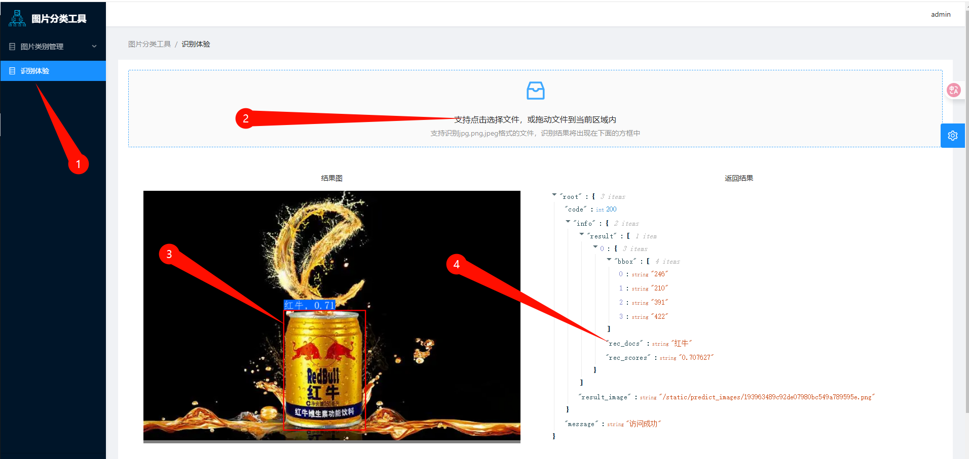 复制{ "code": 200, "info": { "result": [ //图片可能包含多个入库的图片分类内容,所以这个可能返回多个结果 { "bbox": [ //识别到的物体相对于图片的位置 "246", "210", "391", "422" ], "rec_docs": "红牛", //识别到的分类名称 "rec_scores": "0.707627" //识别的概率,0-1 } ] }, "message": "访问成功"}